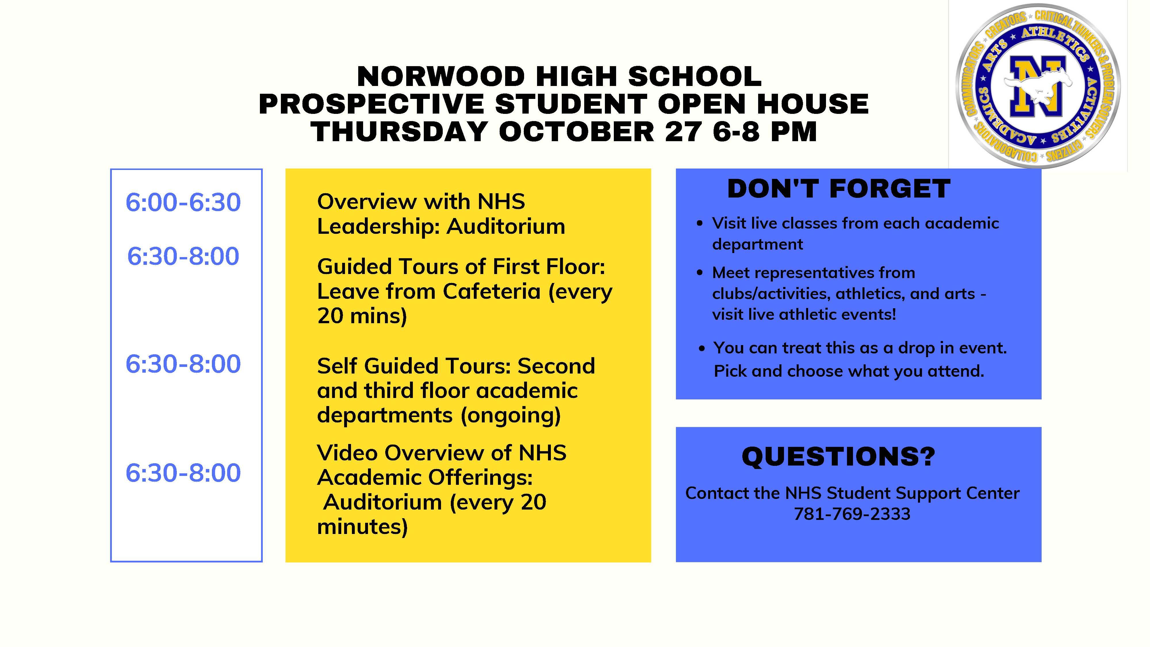 Norwood High School Prospective Student Open House, Thursday, October 26, 2023 6-8pm